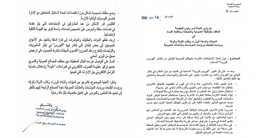 منشور يتعلق باتخاذ الاحتياطات بالهياكل العمومية للتوقي من انتشار فيروس كورونا