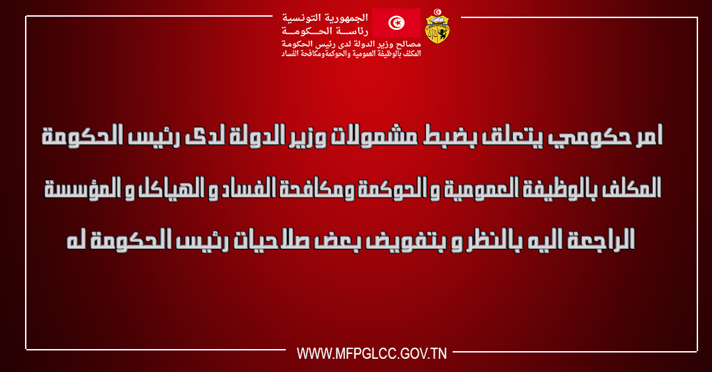 تحميل أمر حكومي عدد 167 لسنة 2020 المؤرخ في 28 أفريل 2020 يتعلق بضبط مشمولات وزير الدولة لدى رئيس الحكومة المكلف بالوظيفة العمومية و الحوكمة و مكافحة الفساد و الهياكل و المؤسسة الراجعة اليه بالنظر و تفويض بعض صلاحيات رئيس الحكومة له