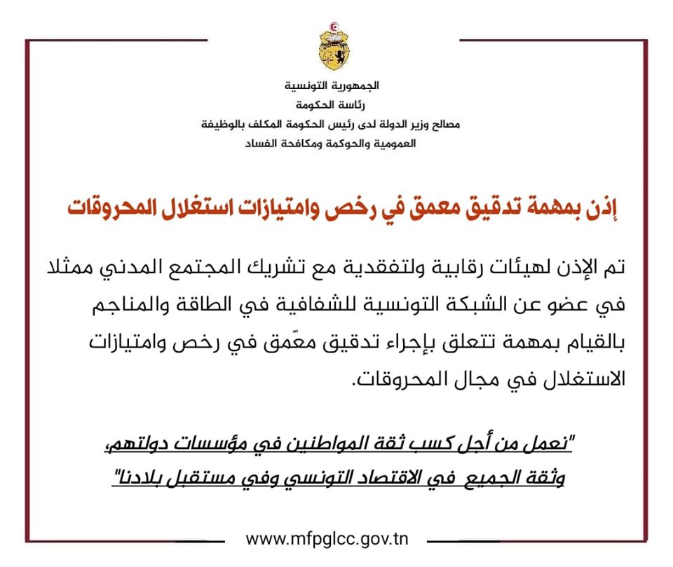 مَهمّة تدقيقِ رخص وامتيازات استغلال المحروقات التي أذن بها وزير الدّولة بتاريخ 28 ماي 2020 وانطلقت فعليا مستهَلَّ جوان الماضي ستبوح بأسرارِها ديسمبرَ القادم، أي بعد شهور عمل ستّة