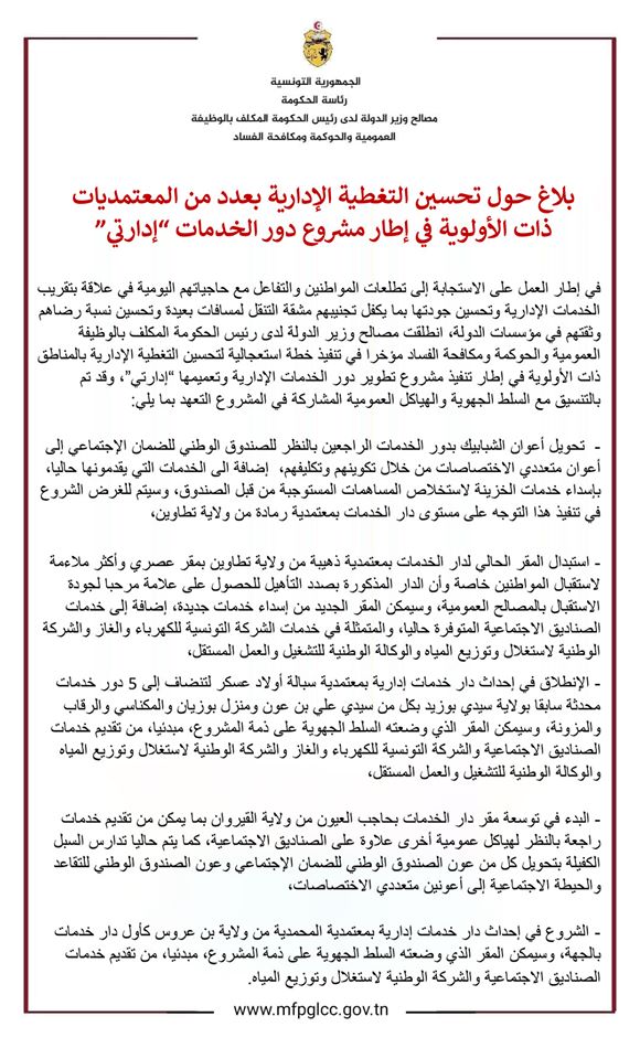 بلاغ حول تحسين التغطية الإدارية بعدد من المعتمديات ذات الأولوية في إطار مشروع دور الخدمات “إدارتي”