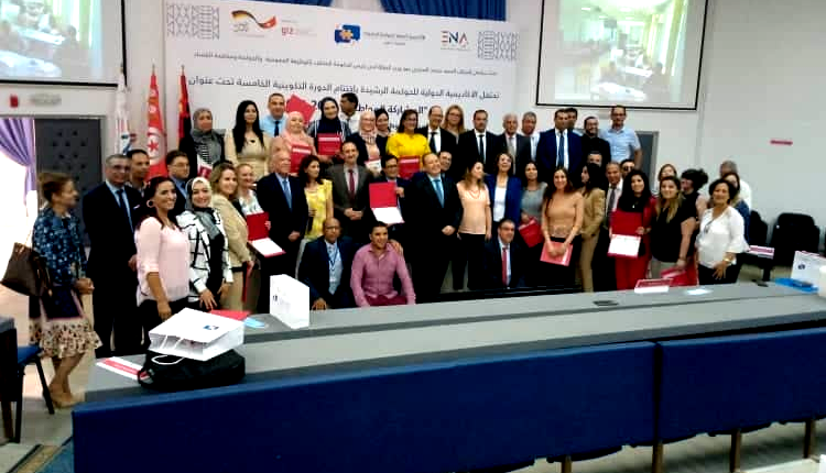 الحفل أشرف عليه رئيس ديوان وزير الدّولة السيّد علي كاهية ورئيسة الأكاديمية الدّولية للحوكمة الرشيدة السيّدة ريم الجلاصي ومدير المدرسة الوطنية للإدارة بالنّيابة السيّد منير عبد اللّطيف، بحضور ضيوف بينهم مستشارة سفارة الجمهورية الفدرالية الألمانية للشؤون السياسية “إليزا أوزبك” ورئيسة مشروع دعم الأكاديمية الدّولية للحوكمة الرّشيدة بوكالة التعاون الألمانية GIZ “ستيفاني هارتر”