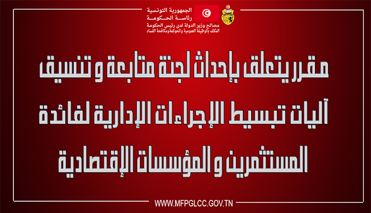 لجنة متابعة وتنسيق جديدة يحدثها مقرر وزير الدولة لدى رئيس الحكومة المكلف بالوظيفة العمومية والحوكمة ومكافحة الفساد الصادر بتاريخ 12 أوت 2020، ستحرص على تفعيل آليات تبسيط الإجراءات الإدارية، تيسيرا لمعاملات المستثمرين والمؤسسات الاقتصادية مع الهياكل العمومية في إطار تعزيز مناخ الاستثمار، كما يضبطه الأمر الحكومي عدد 310 لسنة 2020 المؤرخ في 15 ماي 2020 والمتعلق بضبط شروط وصيغ وآجال تبسيط الإجراءات الإدارية مع المستثمرين والمؤسسات الاقتصادية وتقليص الآجال واستعمال وسائل الاتصال الحديثة واعتماد الشفافية في معاملات.