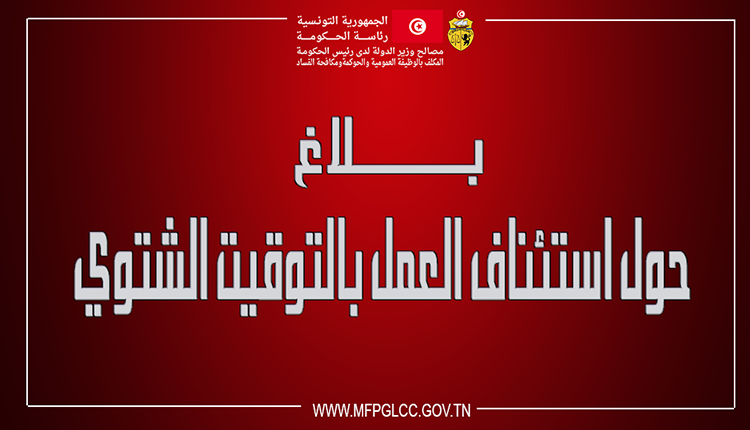 تعلم مصالح وزير الدولة لدى رئيس الحكومة المكلف بالوظيفة العمومية والحوكمة ومكافحة الفساد أنه عملا بأحكام الأمر عدد 1710 لسنة 2012 المؤرّخ في 14 سبتمبر 2012 المتعلق بتوزيع أوقات وأيام عمل أعوان الدولة والجماعات المحلية والمؤسسات العمومية ذات الصبغة الإدارية، يتمّ استئناف العمل بالتوقيت الشتوي ابتداء من يوم الثلاثاء 01 سبتمبر 2020 وذلك على النحو التالي: