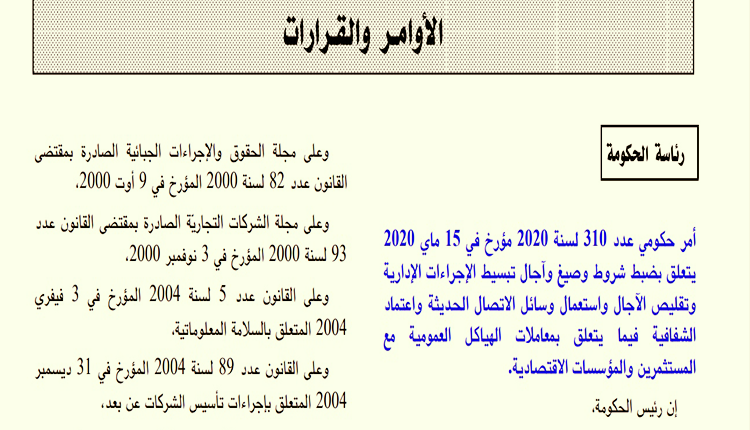اللجنة تضُم ممثلي الوزارات جميعِها، وهي مكلّفة بمتابعة تنفيذ مقتضيات الأمر الحكومي عدد 310 لسنة 2020 المؤرخ في 15 ماي 2020 المتعلق بضبط شروط وصيغ وآجال تبسيط الإجراءات الإدارية وتقليص الآجال واستعمال وسائل الاتصال الحديثة واعتماد الشفافية فيما يتعلّق بمعاملات الهياكل العمومية مع المستثمرين والمؤسسات الاقتصادية.