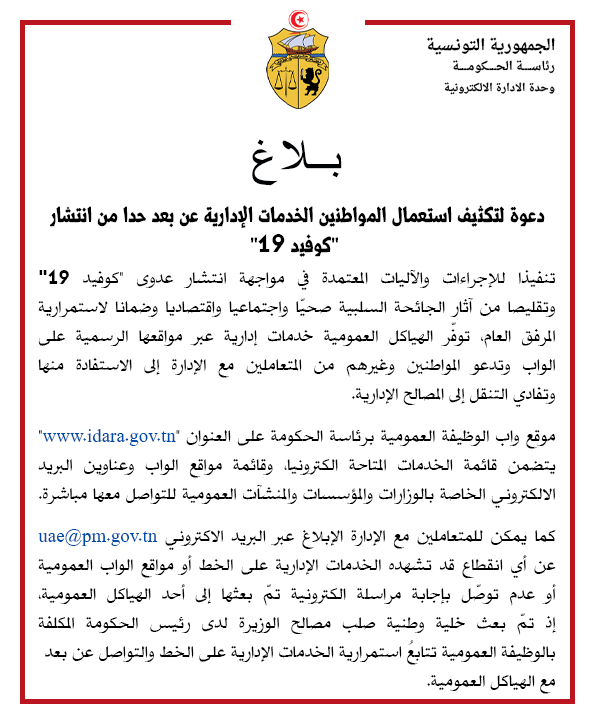 تحميل بـــــلاغ: دعوة لتكثيف استعمال المواطنين الخدمات الإدارية عن بعد حدا من انتشار “كوفيد 19”