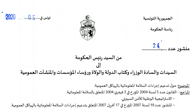 تحميل منشورعدد 24 لسنة 2020 المؤرخ في 5 نوفمبر 2020 حول تدعيم إجراءات السلامة المعلوماتية بالهياكل العمومية