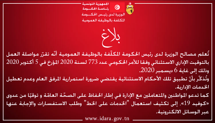 تُعلم مصالح الوزيرة لدى رئيس الحكومة المكلّفة بالوظيفة العمومية أنّه تقرّر مواصلة العمل بالتوقيت الإداري الاستثنائي وفقا للأمر الحكومي عدد 773 لسنة 2020 المؤرخ في 5 أكتوبر 2020 وذلك إلى غاية 6 ديسمبر 2020.