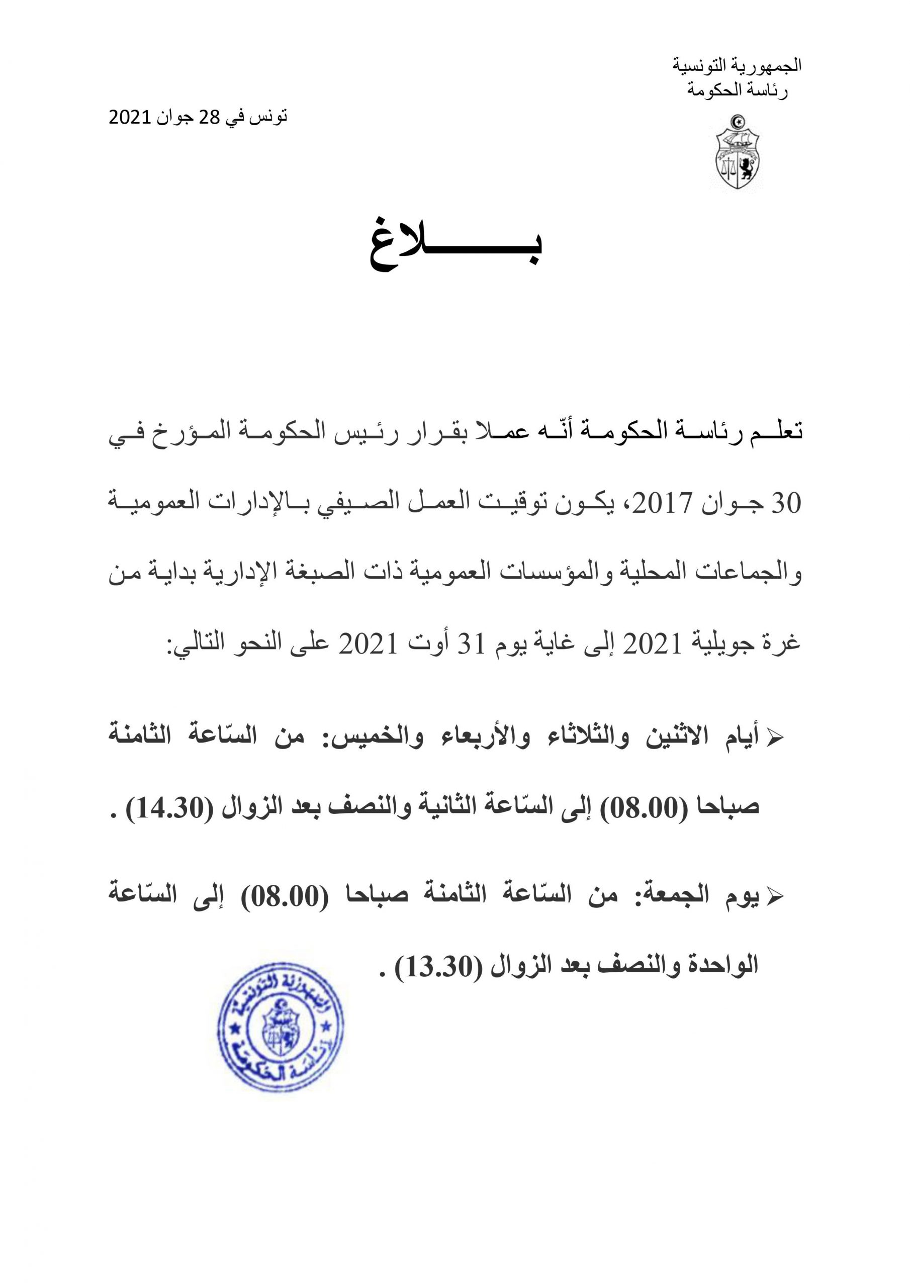 بلاغ توقيت العمل الصيفي