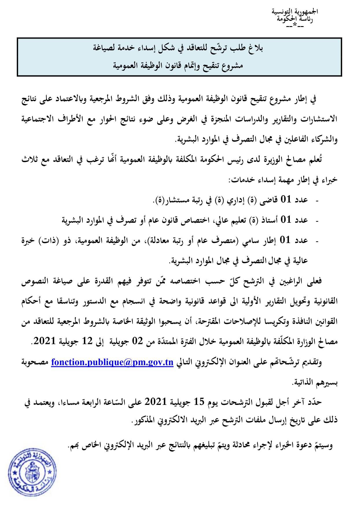 بلاغ طلب ترشّح للتعاقد في شكل إسداء خدمة لصياغة مشروع تنقيح وإتمام قانون الوظيفة العمومية