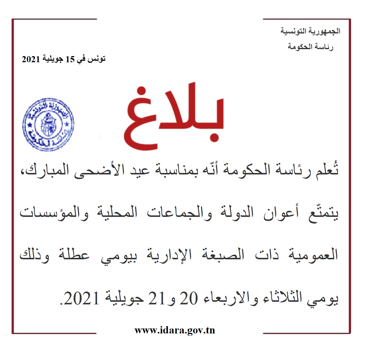 بلاغ عيد الاضحى المبارك